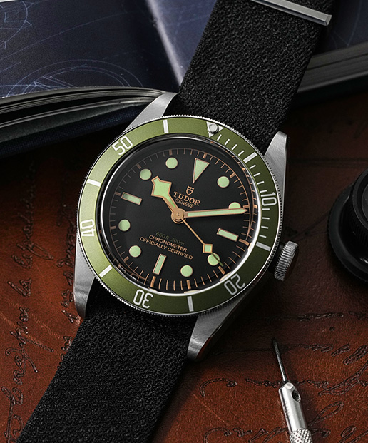Tudor Black Bay Harrods Edition, released in 2016, is a celebration of the department store’s rich history while maintaining Tudor‘s iconic elements. The classic 41mm steel case features Snowflake hands which is also a key feature of Tudor’s diving watches, while the luminous markers on the dial enhance legibility in terms of readability in low-light conditions. However, most striking are the subtle visual nods to Harrods’ legacy. The green bezel and green accents on the dial are a tribute to Harrods’ signature colour scheme, and the depth rating listed in feet first, followed by metres, represents Harrods’ British heritage. Overall, the Tudor Black Bay Harrods edition is a timeless and sophisticated timepiece that perfectly blends Tudor’s strong design aesthetics with recognisable details.