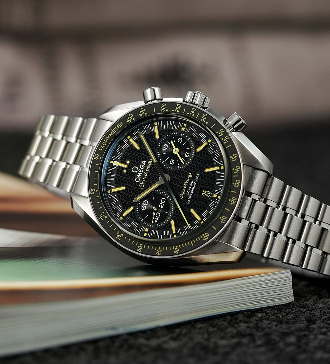 The Omega Speedmaster Super Racing 329.30.44.51.01.003 captures the pulse of motorsport with a masterful blend of design and innovation. Its 44.25mm stainless steel case houses a striking black honeycomb dial inspired by vintage racing models, while a black ceramic bezel etched with a tachymeter scale in vivid yellow grand feu enamel adds energy and contrast. Subtle details like the striped small seconds at nine and the special “10” in the date window marking ten years since the >15,000 Gauss milestone celebrate its legacy of precision. Powering this dynamic creation is the Co-Axial Master Chronometer calibre 9920, the first to feature Omega’s groundbreaking Spirate System, which allows ultra-fine rate adjustments for exceptional accuracy. Certified by METAS and engineered for magnetic resistance, it represents the cutting edge of chronograph watches, combining mechanical excellence with a spirit of relentless performance.