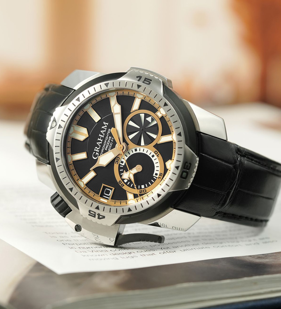 Few watches express boldness quite like the Graham Chronofighter Oversize. Its signature trigger mechanism on the left side of the case allows quick operation of the chronograph functions, inspired by World War II bomber timing systems. The oversized 45mm case, combined with a striking steel bezel and leather strap, makes a powerful visual statement. Inside, the automatic calibre G1750 (also known as G1734 in earlier iterations) runs at 28,800 vibrations per hour, offering a 48-hour power reserve and supporting both chronograph and small seconds functions. The dial’s layered textures, luminous markers, and aviation-style layout give it a commanding presence. Built for those who appreciate mechanical theatre as much as technical mastery, the Chronofighter Oversize transforms the tool-watch archetype into an expressive, modern icon.