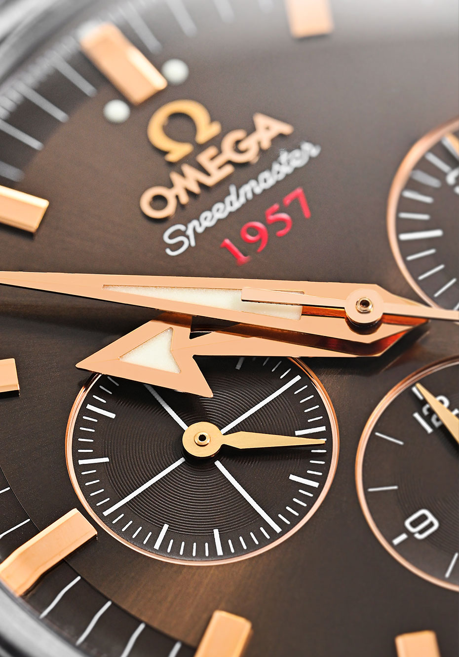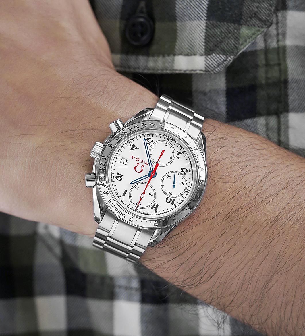 One of the main reasons behind Speedmaster’s desirability is its classic design and artistry. The original Speedmaster (referenced as CK2915) is similar to the Speedmasters produced in current times. This Omega watch featured a three-register layout with sophisticated slim lugs, streamlined hour markers, and small button pushers at two and four o’clock positions. It had a large-sized case (39 mm) made of stainless steel. It also featured a separate tachymeter at the bezel, separated from the dial, giving it a clean and easy-to-read look. This timeless model was water-resistant up to 200 feet, shock-proof, and anti-magnetic. Finally, the classic Speedmaster offered a supreme degree of precision and used characteristic arrow-shaped hands, which are still featured on Omega’s latest models.