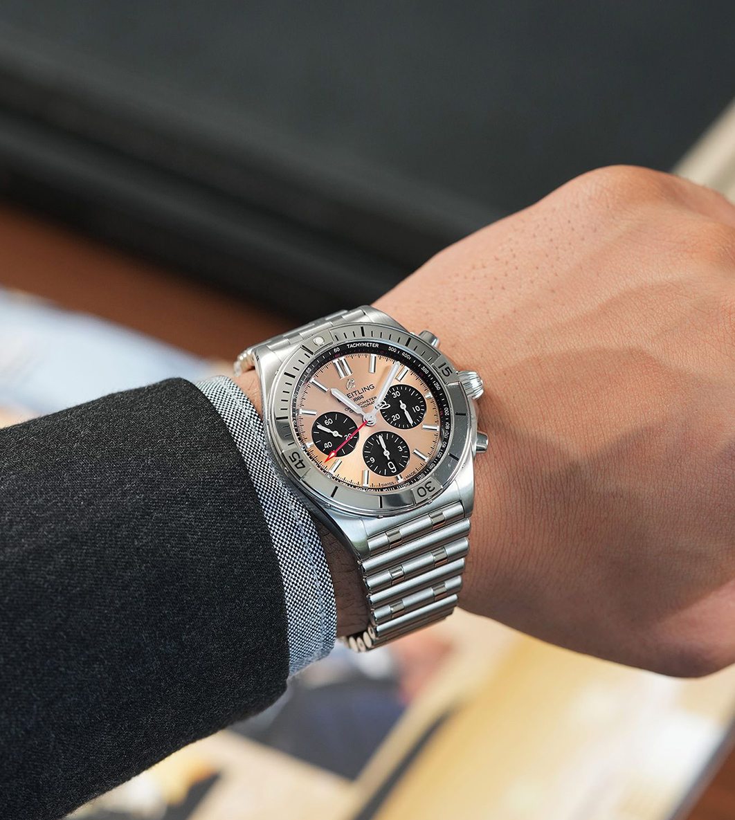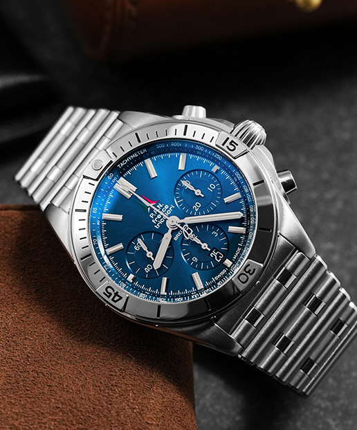 Originally designed in 1984 for aviation professionals, Breitling Chronomat boasts its robust design. Initially designed for pilots, its design has evolved from two sub-dials to three sub-dials in modern versions. To ensure accuracy, the collection features a rotating bezel, distinctive rider tabs, and advanced chronograph movements. Typically 41mm to 44mm in diameter, these timepieces are crafted in stainless steel, 18k rose gold, two-tone combinations, or titanium, providing a commanding presence on the wrist.