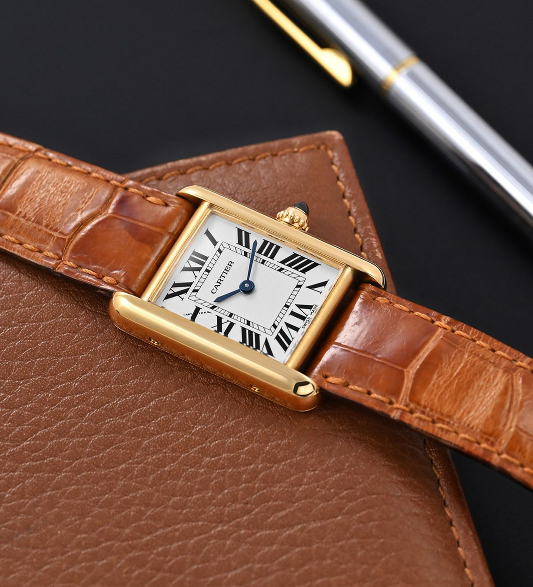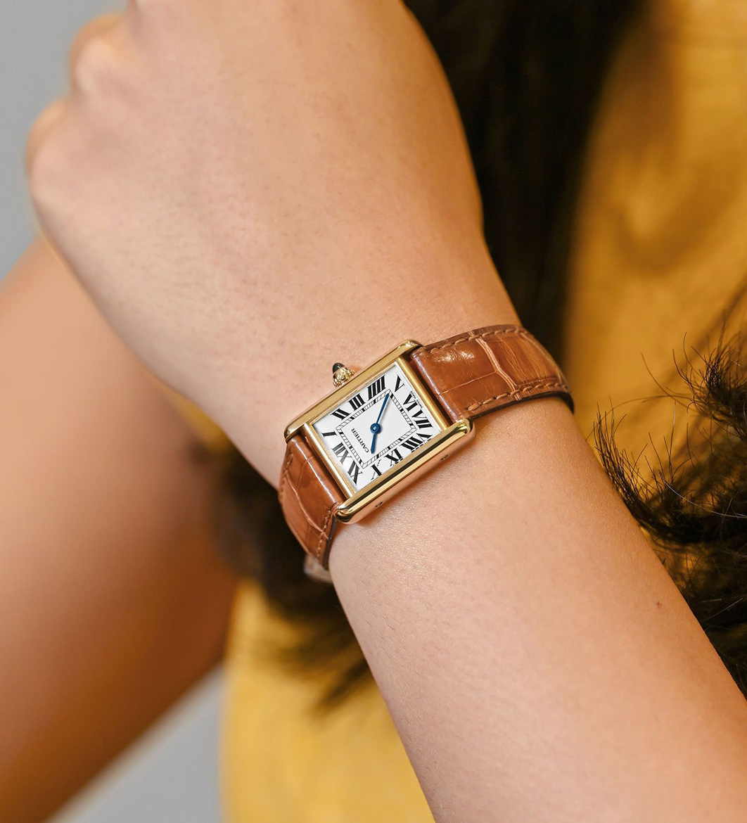 First introduced in 1917, the Cartier Tank collection is an icon of elegance. These watches, available in various variants, exude quiet yet undeniable luxury. The model features rectangular cases and clean lines with refined detailing, making it a quintessential symbol of timeless sophistication. Its blue steel hands are a signature touch, making it not just a timepiece but a legacy of style. This model balances artistry and precision harmoniously with its gold, steel, or intricate diamond accents. The crown of this model displays a small sapphire cabochon, which gives a peek into Cartier’s refined watchmaking.
