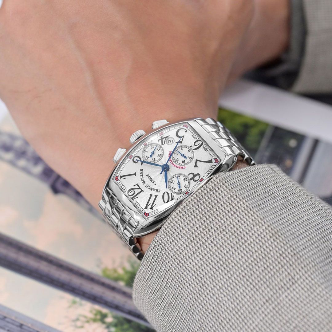Franck Muller’s signature tonneau-shaped case defines several collections, including the Cintrée Curvex, Casablanca, and Vanguard. First introduced with the Cintrée Curvex in the early 1990s, this curved, elongated design became a hallmark of the brand, blending ergonomic comfort with striking visual appeal.