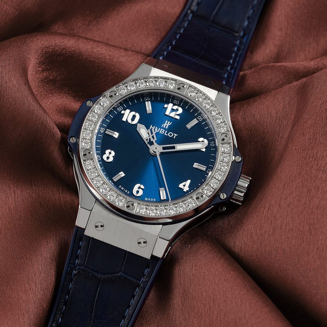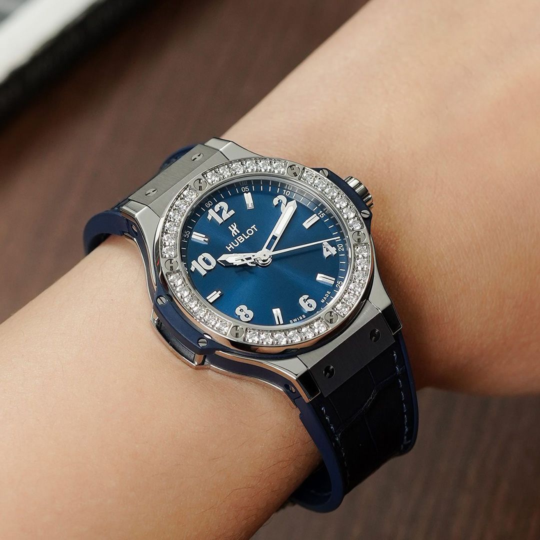 The Big Bang has always been bold, but in this 38mm rendition, it leans toward sophistication. The case is crafted in steel, its cool tone offset by a bezel set with a circle of shimmering diamonds that add just the right amount of spark. The dial is a deep, inviting blue, simple yet richly textured to hold the gaze, paired with a matching rubber-leather strap in blue for tonal harmony. Inside beats the HUB2900 quartz calibre, reliable and understated, keeping attention on design and comfort rather than mechanics. It is a dress expression with unmistakable Hublot character, surprisingly refined against formal wear.