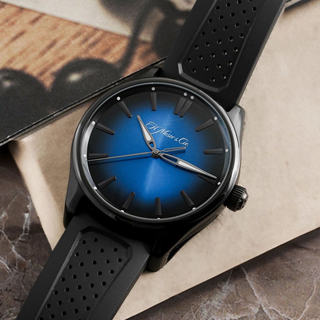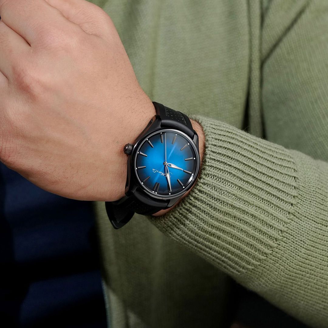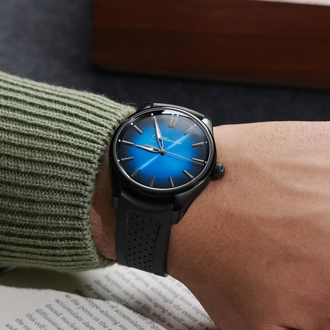 The Pioneer brings Moser’s contemporary spirit into the realm of refinement. Measuring 42.8mm in diameter, this stainless steel watch features a dark, subtly brushed case, making a strong first impression while maintaining elegant proportions. The dial is a signature fumé, transitioning from charcoal at its edges to blue at the centre, a play of depth that alters with light as the day moves. Through the sapphire crystal back, one discovers the automatic calibre HMC 200, crafted in-house with Moser’s trademark finishing and offering a robust 72-hour power reserve. On a rubber strap, the Pioneer carries an effortless versatility, modern sport-luxury blending seamlessly into dress-watch elegance.