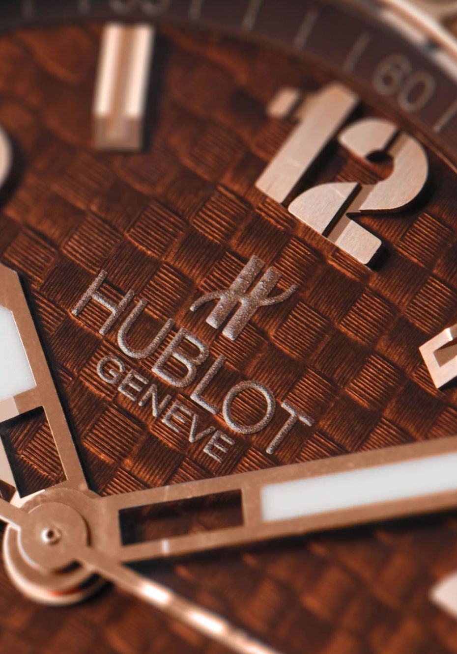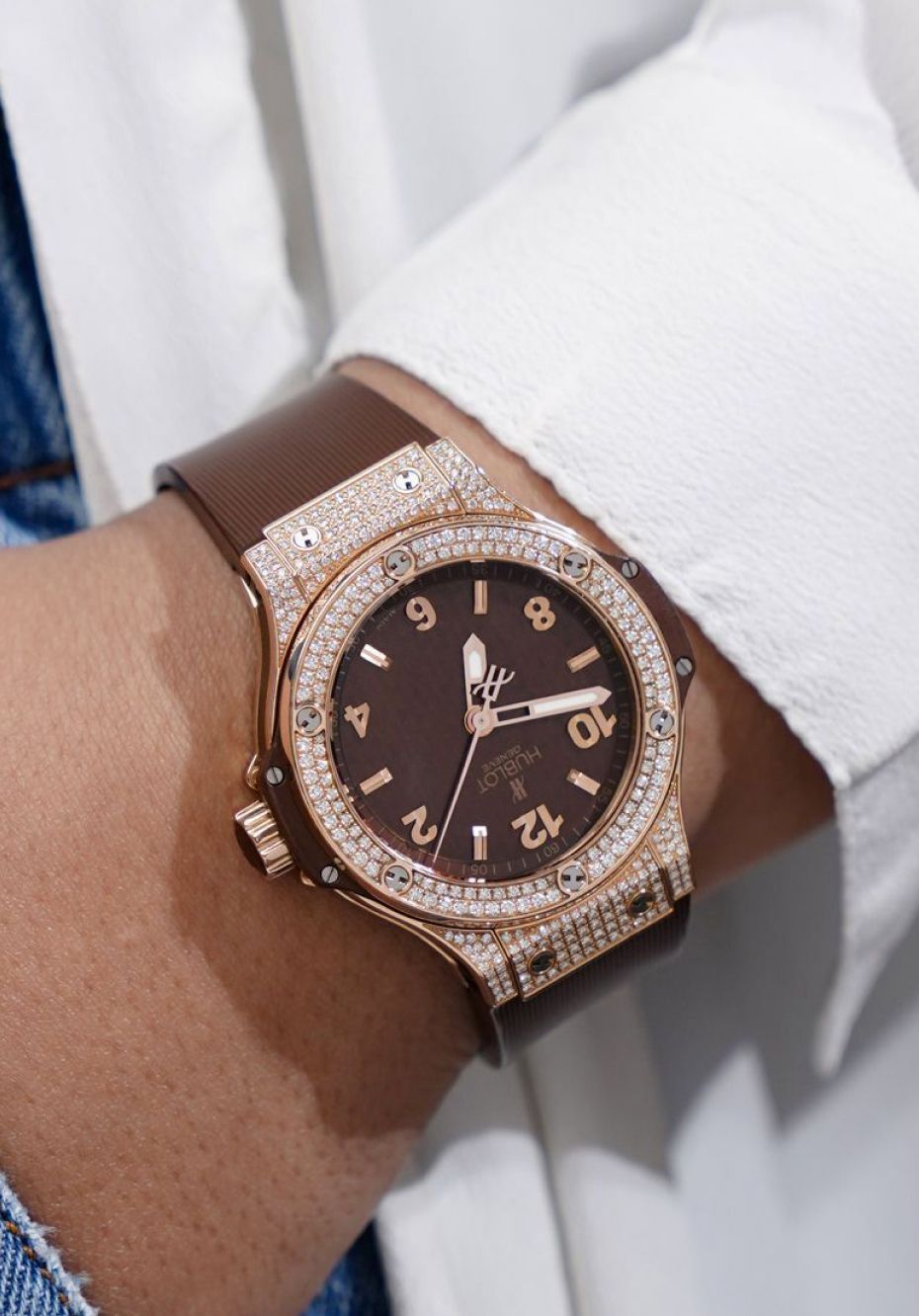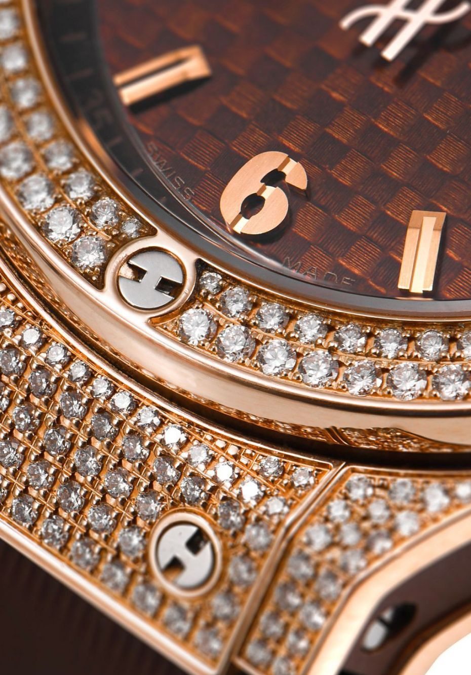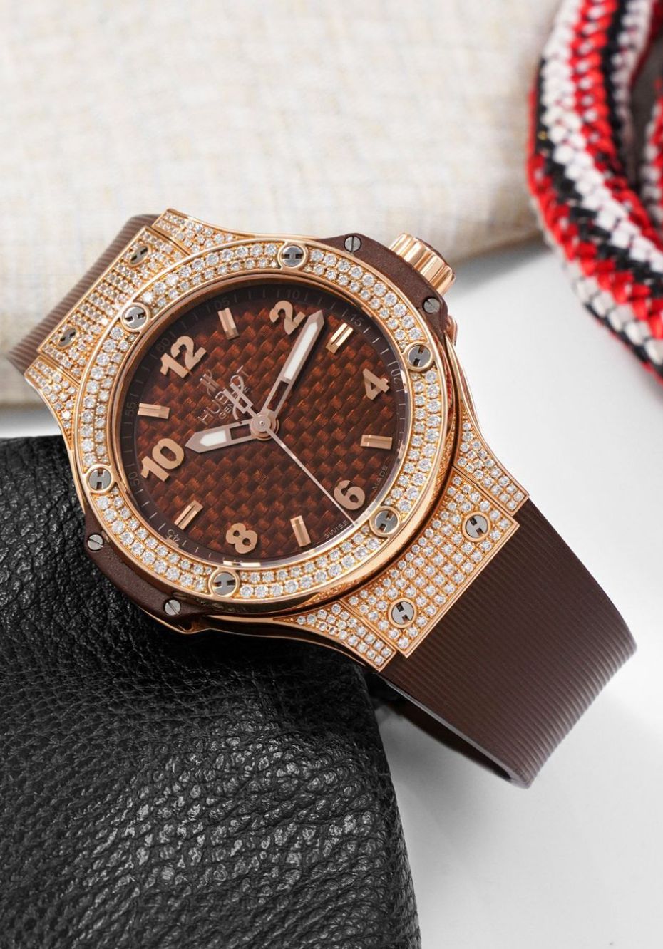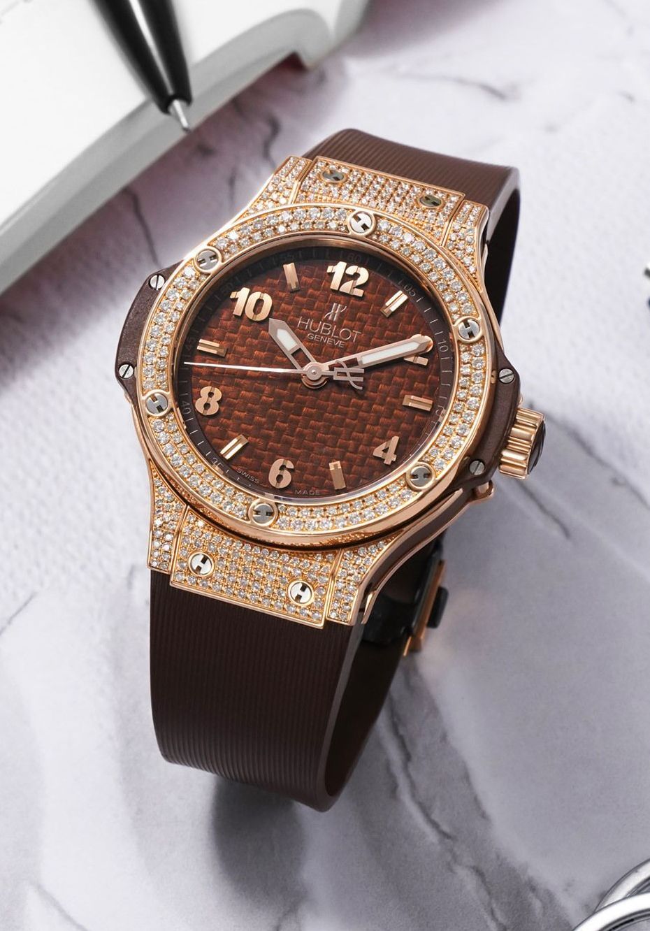 Diamond embellishments across the bezel and case elevate the visual presence. The brown dial harmonises perfectly with the case material for sophisticated elegance. A matching rubber strap ensures practical comfort with a refined appearance. This iteration demonstrates remarkable versatility within the Big Bang design language. The unisex proportions in this luxury watch celebrate inclusive sophistication beyond conventional gender constraints.