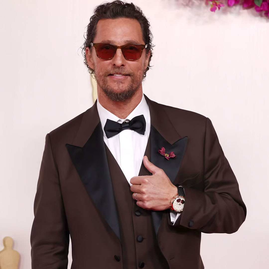 Matthew McConaughey decorated the Oscars 2024 as a prestigious presenter of the Best Actor. His attire on the red carpet wasn’t just alright, alright, alright. He made a bold fashion statement by accessorising his brown and black Versace tuxedo with a Jacob & Co. Jean Bugatti. The exquisite watch features a dual structure composed of 470 components. Distinctively designed time-keeping part possessed a peripheral time display with a dedicated barrel and twin tourbillons. It manifests brilliance with another digital minute display. The technical environment of the Swiss movement JCFM09 consists of a combination of springs, levers, clutches, and mirror-polished bridges.