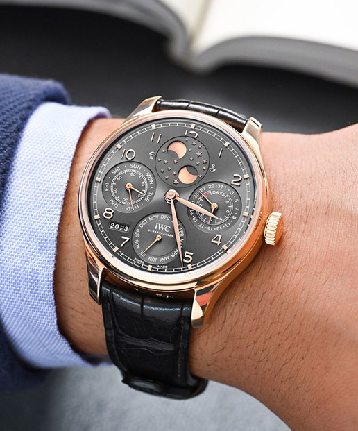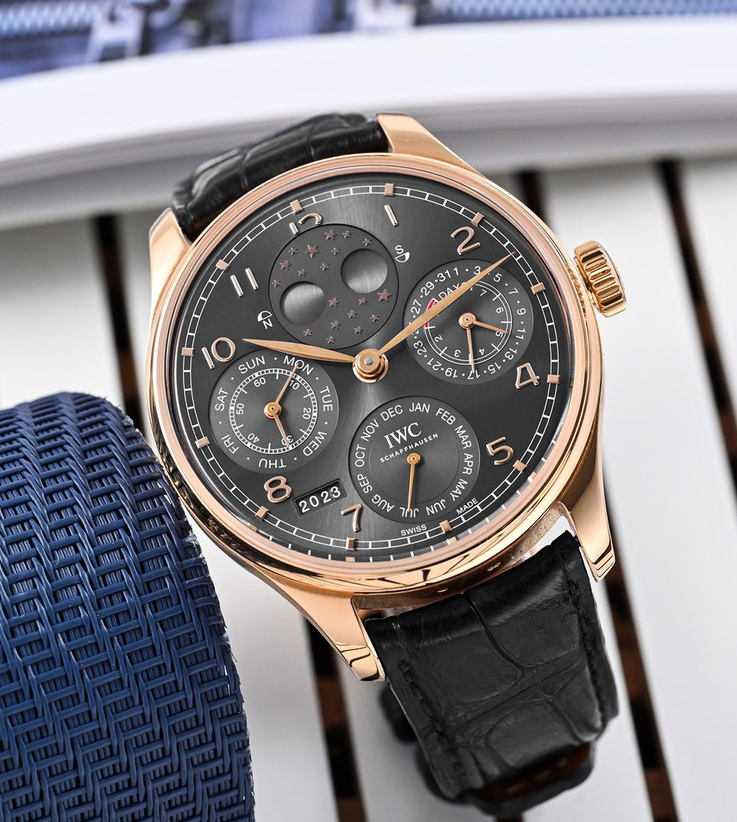 The IWC Portugieser Perpetual Calendar embodies timeless elegance with a twist of mechanical genius. Its captivating essence lies within the harmonious dance of complications on its slate-coloured dial. Beneath the classical exterior resides the IWC-manufactured 52615 calibre movement, a mechanical marvel orchestrating a perpetual calendar complication. This complication, represented with impeccable finesse in sub-dials, is a symphony of date, day, month, year, and moon phase indicators, all performing in exquisite harmony. The moon phase aperture is reminiscent of a breathtakingly beautiful starry night sky with a double moon display and a star-decked backdrop.