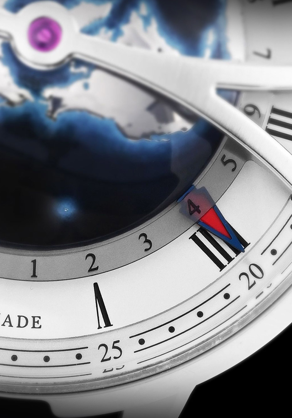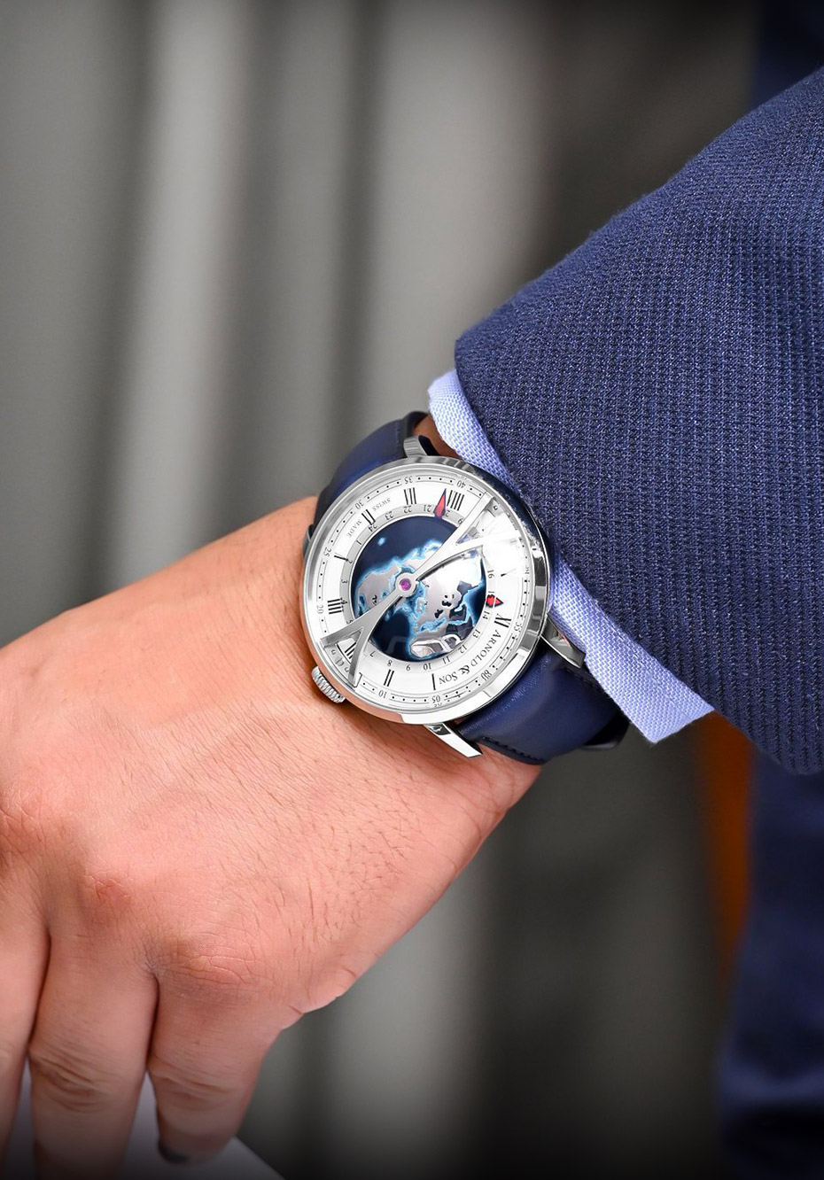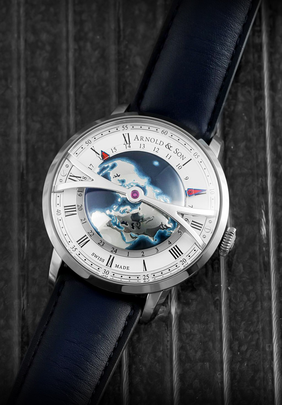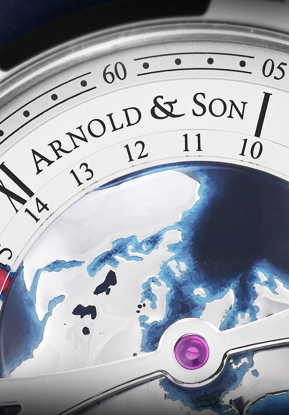 The Arnold & Son Globetrotter is a high-octane take on a travel watch. Its exceptional allure lies in the intricately hand-painted globe that graces its dial. The raised globe, held aloft by a graceful arch bridge, beautifully depicts the Northern Hemisphere as seen from space, its elegance magnified by the domed sapphire crystal glass. Furthermore, the convenient integration of the world-time function allows you to track time zones across the planet effortlessly.