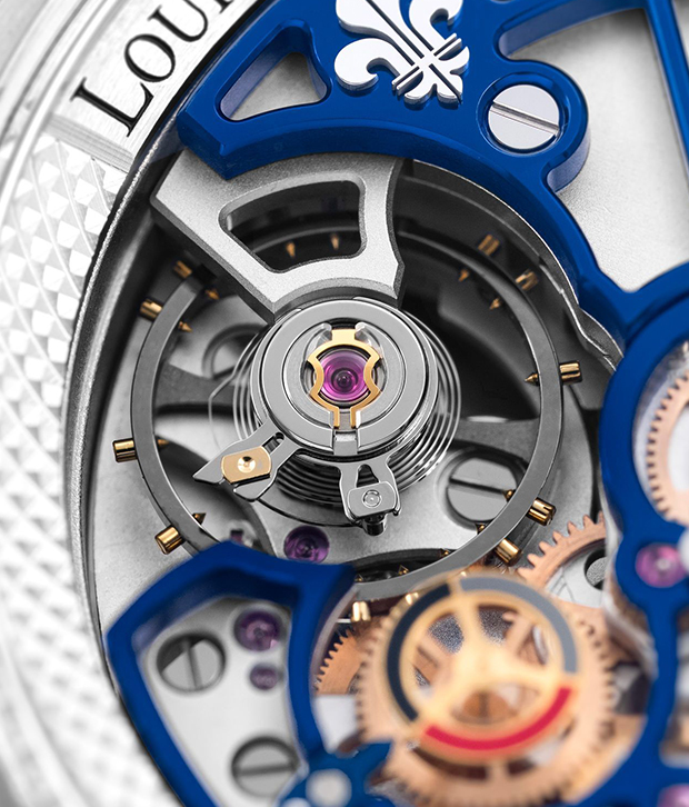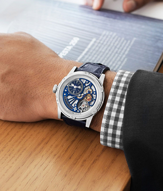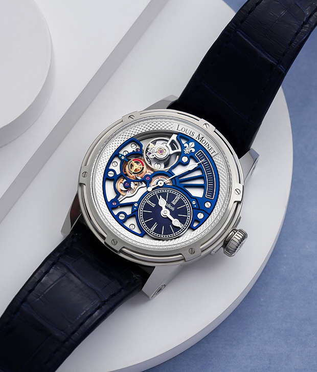 The Louis Moinet Tempograph Chrome is a masterpiece that stands as a testament to the brand’s heritage and its commitment to pushing the boundaries of design. At its core, the Tempograph Chrome is a stunning example of aesthetic innovation. The skeleton dial introduces a vibrant Moinet Blue hue, enveloping the intricate bridges and the inner flange. The Clou de Paris pattern gracing the outer flange and the off-centre dial at four o’clock adds depth and dimension to the watch’s design, making it a visual masterpiece that exudes elegance and creativity.