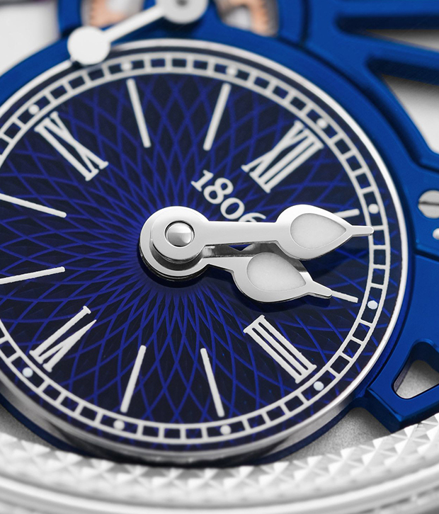 But while the dial draws you in, the skeletonised double hairspring tourbillon sitting at six o’clock catches your attention like no other. This tiny opening gives you a peek into the beating HMC 804 automatic movement. Further adding to the mysteriousness of this extraordinary watch is the brand text inscribed in transparent lacquer for a very delicate and subtle yet remarkable addition.