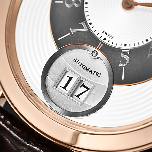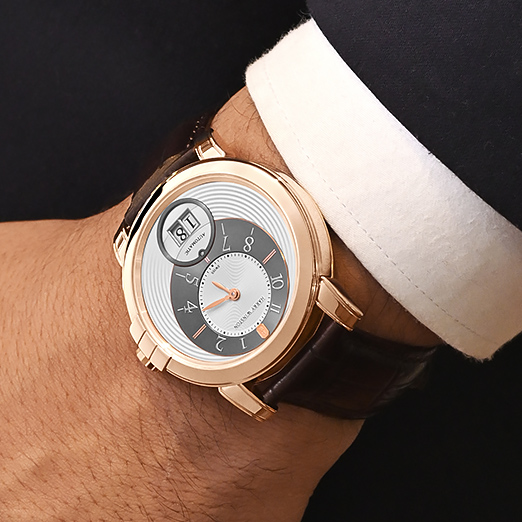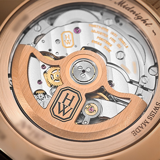With a width of 42mm and only 10mm thickness, the Midnight Big Date wears quite elegantly on the wrist. The case, rendered in precious 18k rose gold, carries a curvaceous silhouette with smooth lines and a delicate polished finish throughout. With a lovely silver dial housing a confident configuration of off-centred hours and minutes at 12, the date complication at six o’clock and an appealing guilloché pattern, the watch is a handsome but unconventional expression of a classic dress watch. Notice the dainty diamond tucked at the contour of the date aperture — a graceful nod to the brand’s penchant for the fine gemstone. The refined finishing on the self-winding calibre HW3101 is visible through the sapphire crystal caseback; it guarantees a power autonomy of 72 hours. Overall, it’s a nicely-executed, toned-down Harry Winston made for the modern wrist.