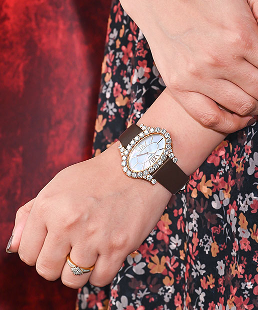 With outrageous gem-setting and fine craftsmanship, this custom-made L’Heure du Diamant amalgamates luxury with beauty. Endowed with a 40mm 18k rose gold case and a pleasant mother-of-pearl dial, this creation is topped by thirty-six brilliant-cut diamonds on the oval-shaped bezel and lugs. Each of these diamonds is placed in a delicate crown setting exuding a mesmerising charm that showcases the maison’s deep-rooted commitment to magnificence. It is complete with a single briolette-cut diamond on the crown and 15 more on the clasp that secures the brown satin strap. Powered by a reliable quartz movement, this women’s watch is ready for anything, serving as a standout piece perfectly suited for your next gala or party.