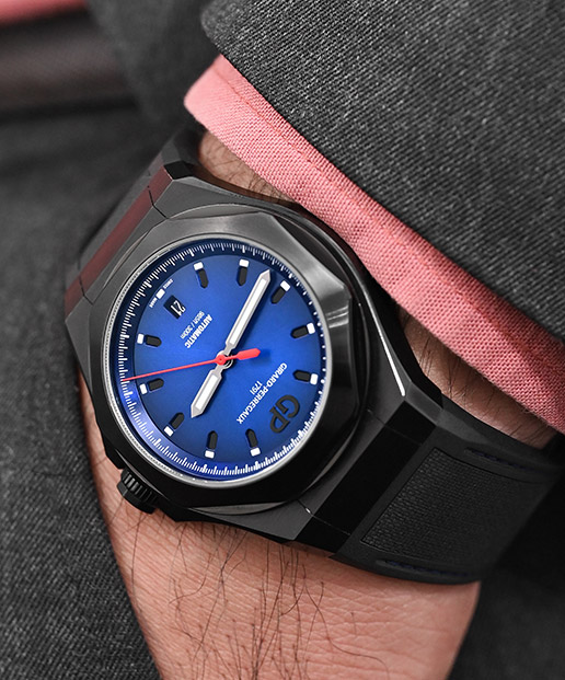 Girard-Perregaux Laureato Absolute boasts a distinctive 44mm PVD-treated titanium case for a striking look. Its dial features silver-tone hands and markers, with a date aperture at six o’clock. The recognisable design elements make the wristwatch an essential creation of classic watchmaking from the maison. In 2019, the brand introduced the Laureato Absolute collection, featuring an identifiable silhouette. This Absolute reference exhibits a closed caseback with the brand name and signature engraved at the centre. Unlike other elements that were switched, this model has retained the typical Laureato design characteristics, like the octagonal case shape. In place of the Clous de Paris, this model exhibits a sandwich dial with blue and black gradient sunray finish with luminous markers, hands, and red seconds hand. Also, the bracelet is swapped for a black integrated rubber strap with a folding clasp.
