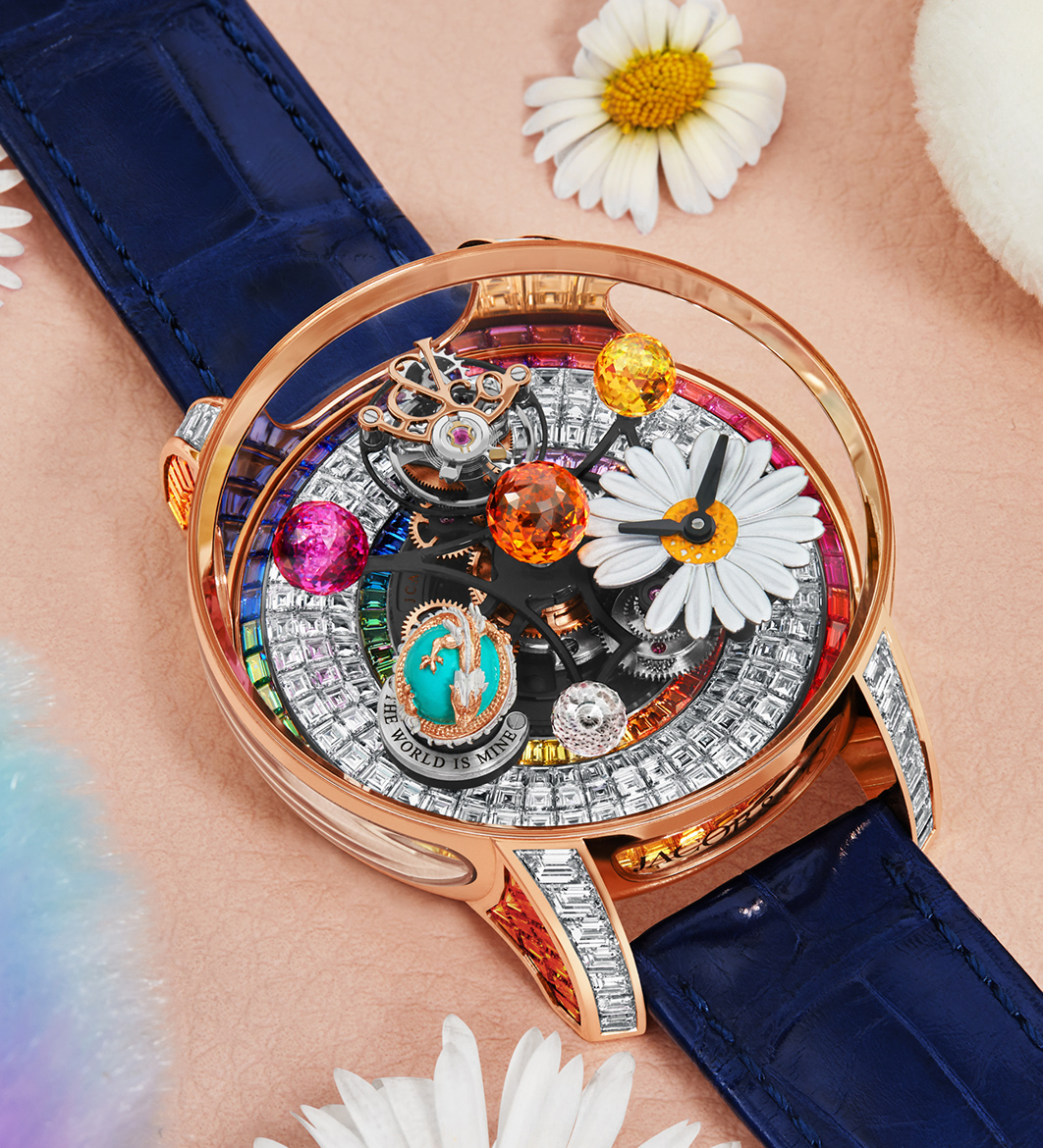 Interwoven into this dynamic architecture is the PEACEMINUSONE daisy, delicately positioned amid the celestial display. This small yet powerful emblem injects a layer of personal identity into the watch, making it a wearable art that narrates a story.