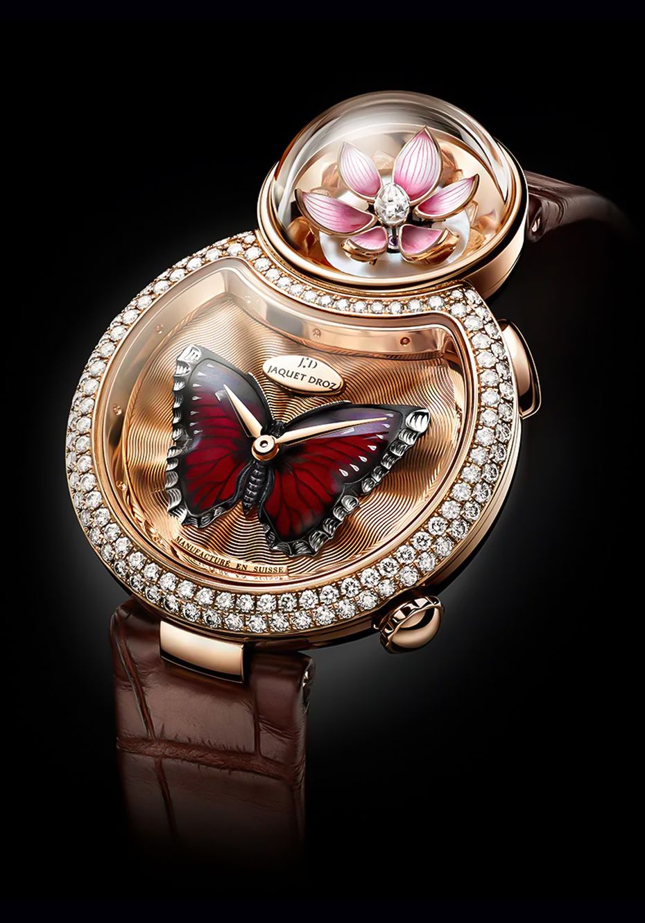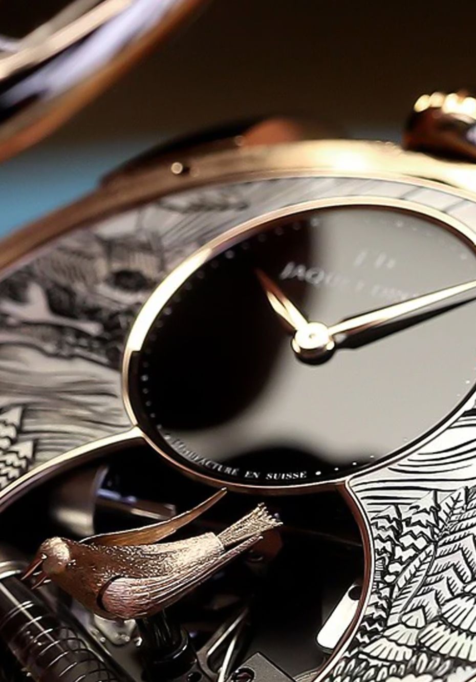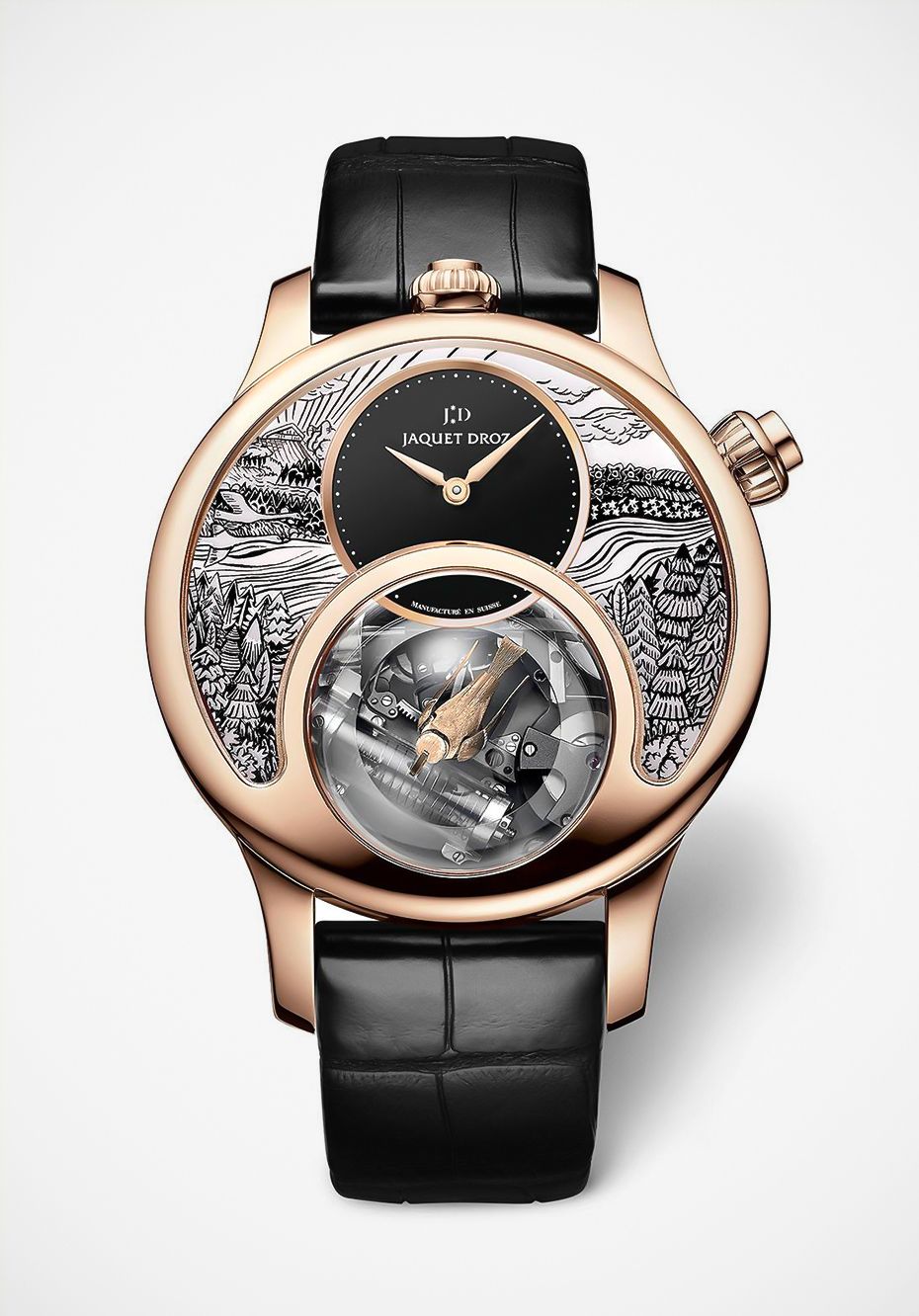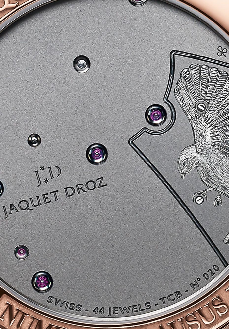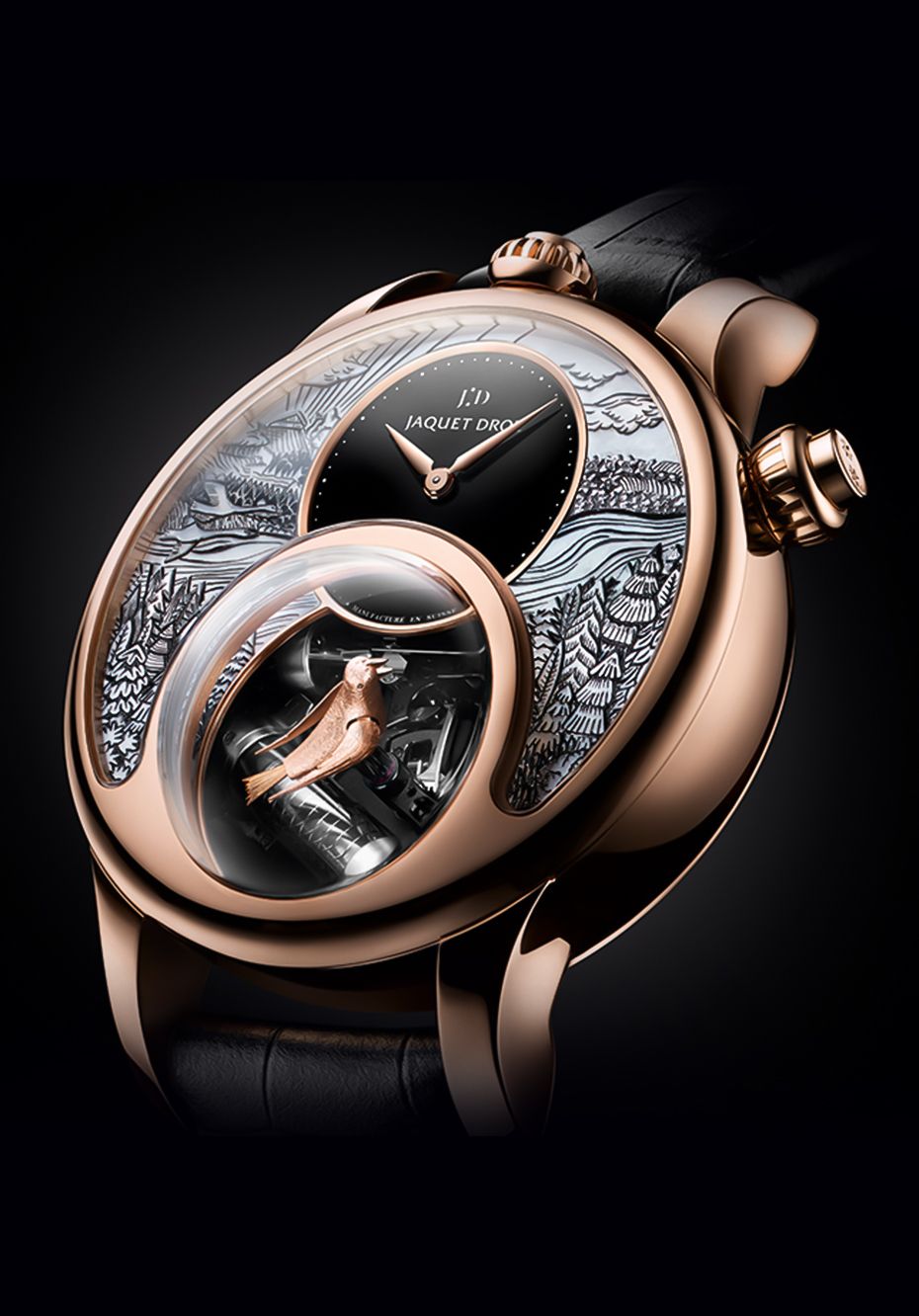 In 2013, the maison unveiled The Charming Bird, an automaton singing bird wristwatch. Through meticulous research and miniature mechanisms, the maison created an automatic singing bird on a wristwatch – a first in watchmaking. Just as the brand’s automatons amazed centuries ago, The Charming Bird represents the pinnacle of Jaquet Droz’s mechanical engineering and design. So much so that it even won the Grand Prix d’Horlogerie de Genève in the “Mechanical Exception” category in 2015.