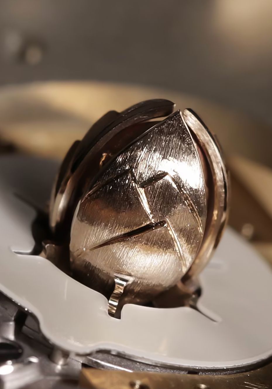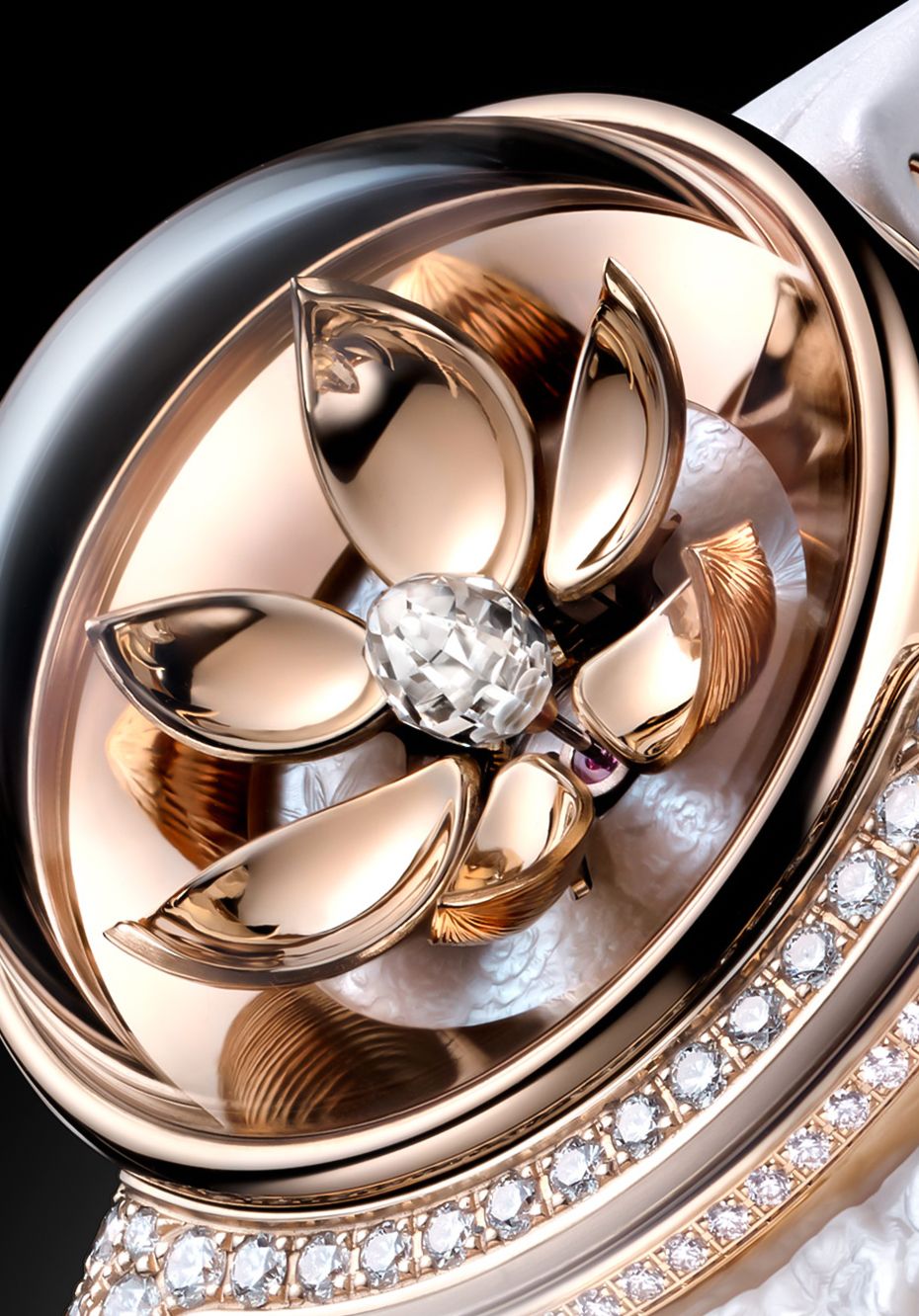 Jaquet Droz, renowned for its expertise in automatons dating back to the 18th century, brought this unique expertise to its Lady 8 Flower collection in 2015. It marked the brand’s first automaton in a women’s collection. The automaton mechanism animates the petals of a three-dimensional lotus flower, enabling them to gracefully open and close as desired. Upon opening, a central pistil, adorned with either a diamond or sapphire, is revealed within the flower.