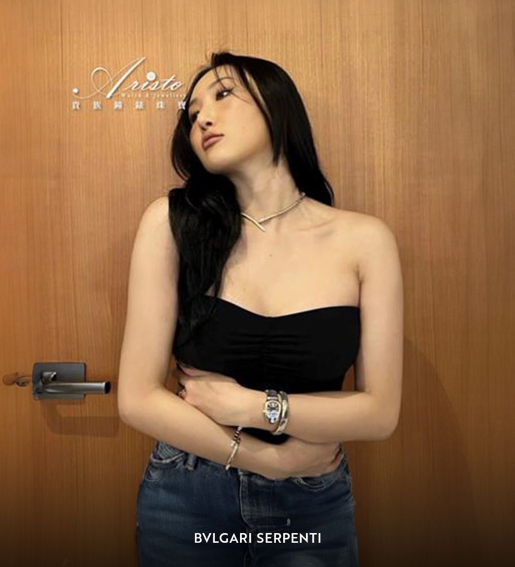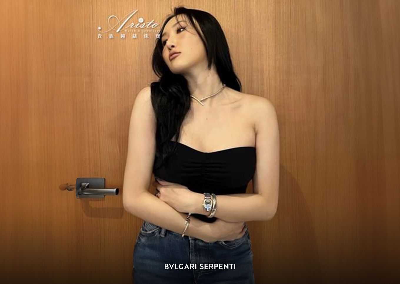 Hwasa of MAMAMOO personifies confidence, with her Bvlgari Serpenti Tubogas acting as a natural extension of her commanding persona. Equal parts bracelet and timepiece, the Serpenti wraps around her wrist with a sinuous charm that mirrors her stage presence. Unlike more straightforward watches, the Serpenti thrives on duality, much like Hwasa herself.