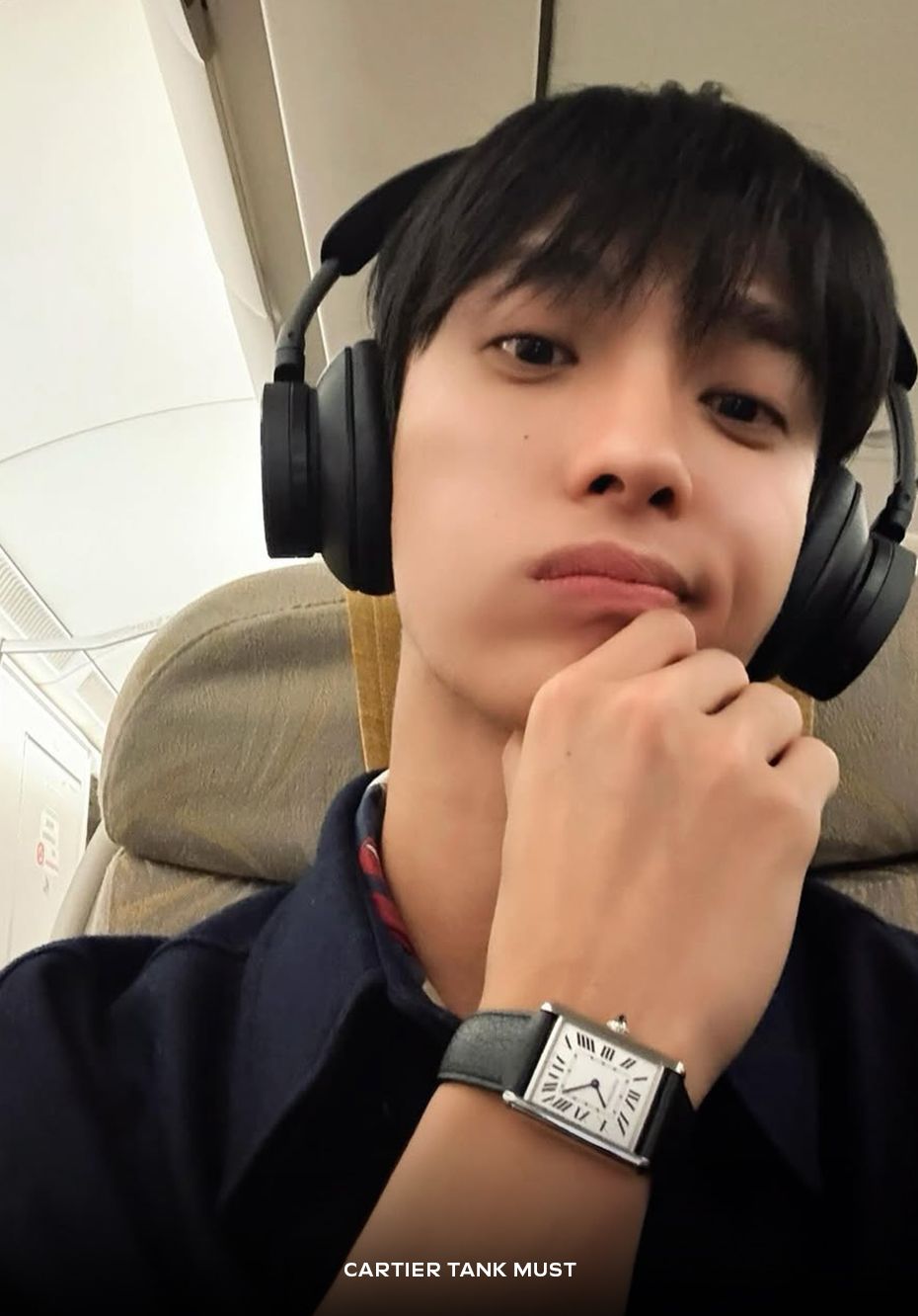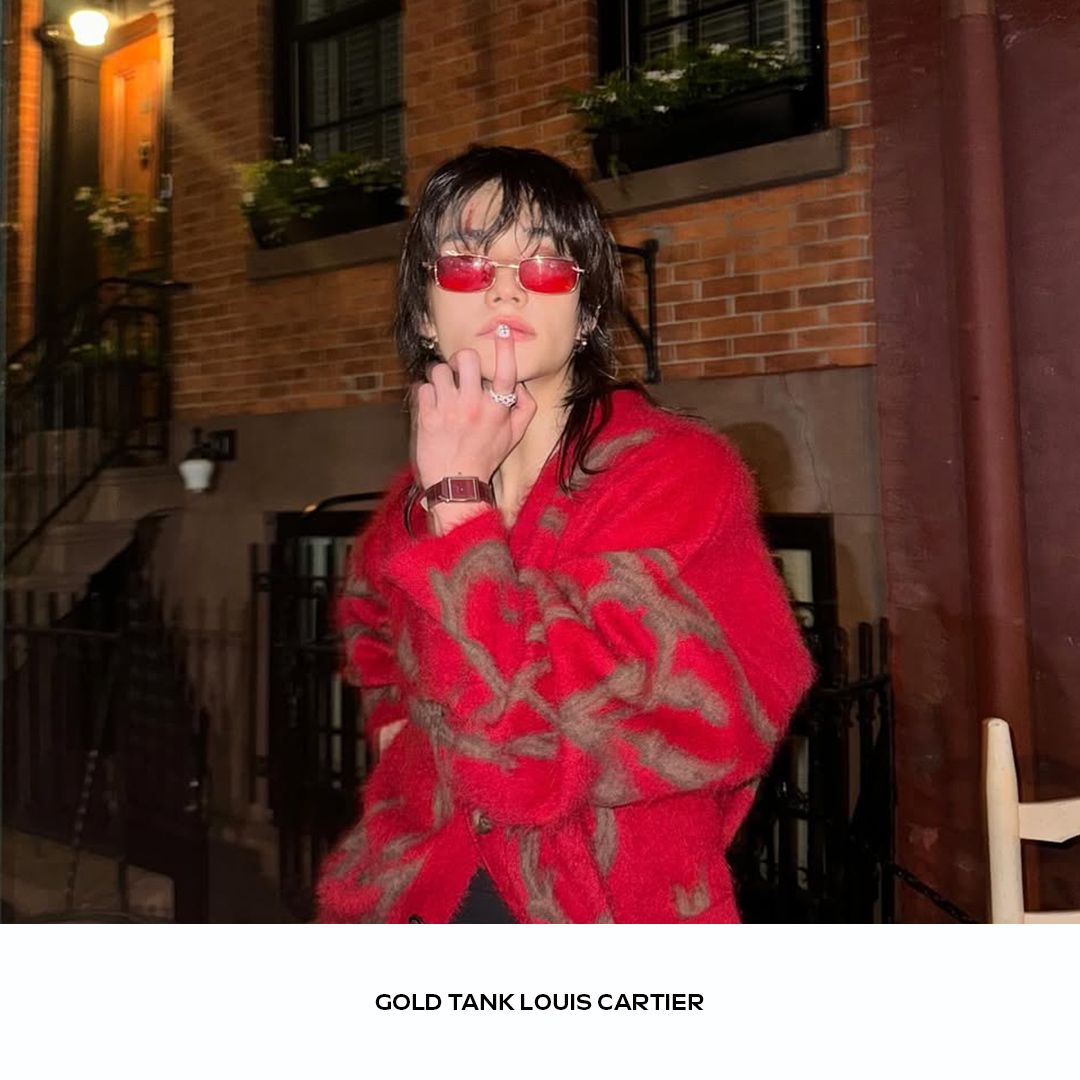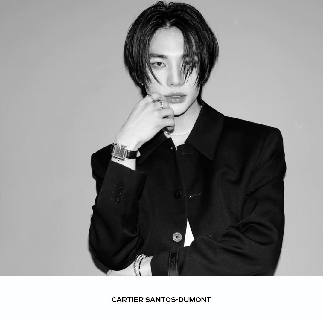 Among the new generation of K-pop idols embracing horology, Stray Kids’ Hyunjin stands out for his cultivated Cartier collection. His Tank Louis Cartier in yellow gold, paired with a striking red dial and strap, communicates boldness within a disciplined frame. Meanwhile, his Santos-Dumont, distinguished by a black lacquered bezel, speaks to his appreciation for Cartier’s evolution of its aviation roots.