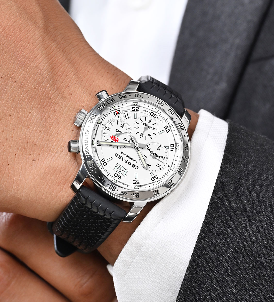The functions on offer span from fuel gauge-like power reserve indicator to chronograph and GMT. While specific models, like the Gran Turismo, are fitted with a stylish leather strap, others are available with rubber straps modelled after the treads of motorsport tyres. The Mille Miglia is a bold timepiece that is highly functional and at the forefront of fashion.