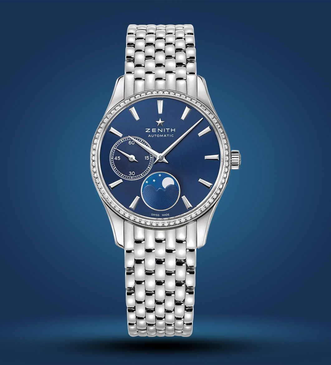 Gaze upon the Zenith Elite, and you sense the infinite night sky captured on your wrist. Its 33mm steel case is capped by a bezel set with diamonds that catches every turn. A deep-blue dial houses silver-toned dauphine hands. These hands traverse index hour markers with balletic elegance. Two masterfully crafted sub-dials display the small seconds and a poetic moonphase complication.