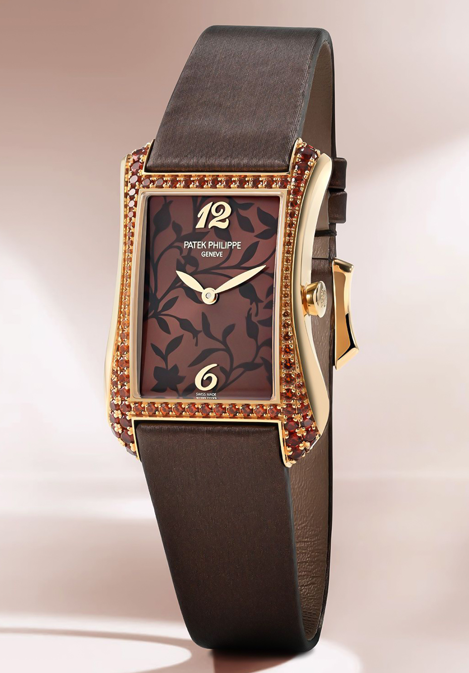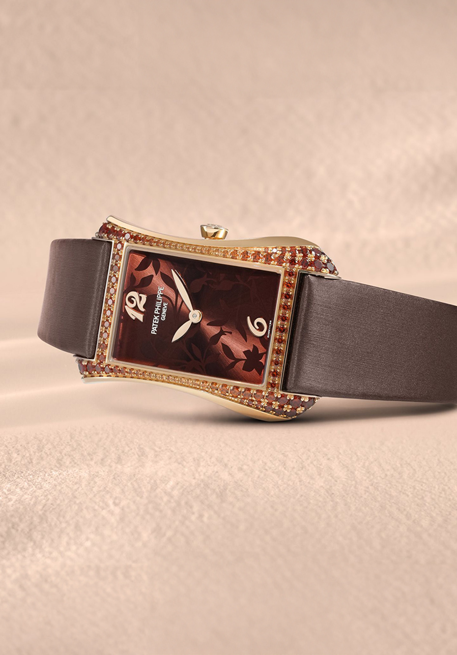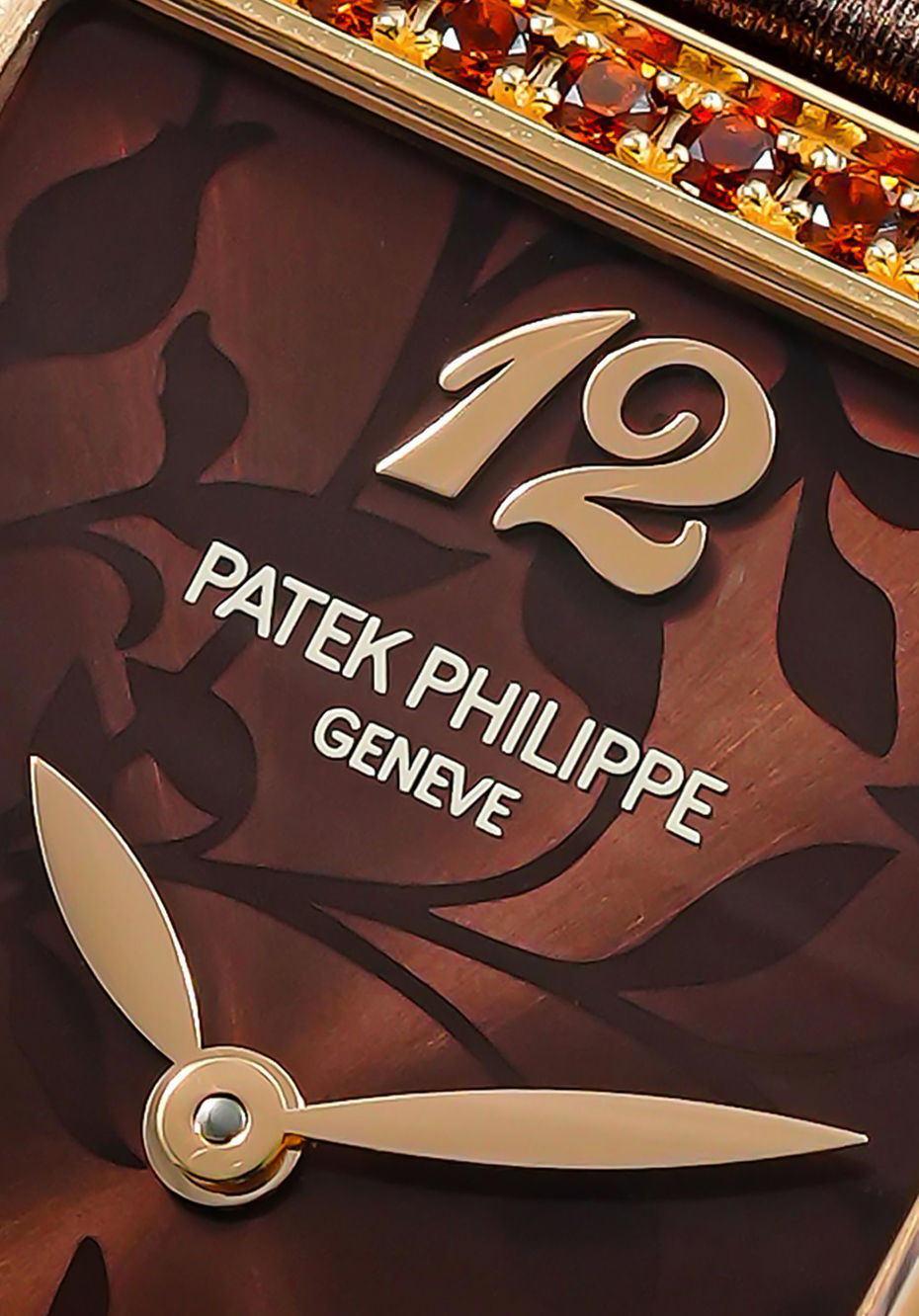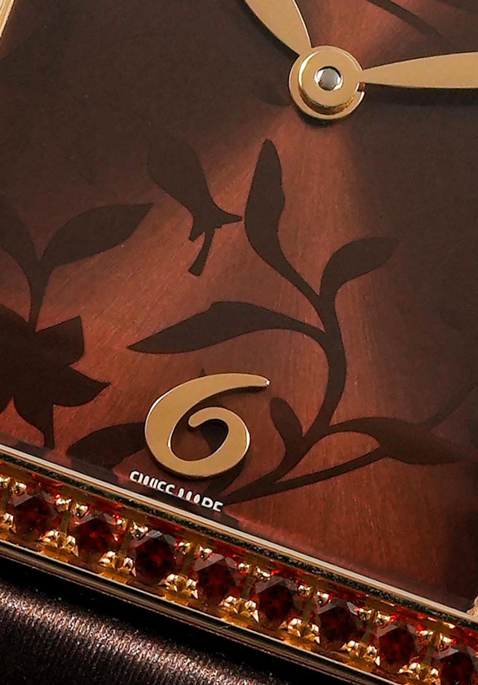 Encased in 18k rose gold, the watch is defined by a bezel set with 94 brilliant-cut spessartites, their cognac-to-mandarin gradient radiating warmth. The case carries a presence without excess, just 7.36mm in thickness to retain grace on the wrist. The dial is finished in a rich brown lacquer, adorned with a delicate floral motif. Gilt Arabic numerals and leaf-formed hands bring vintage softness, reminiscent of early Patek Philippe style. Inside is a quartz calibre, selected not as a compromise but rather as a considered choice to preserve slender elegance and faultless reliability.