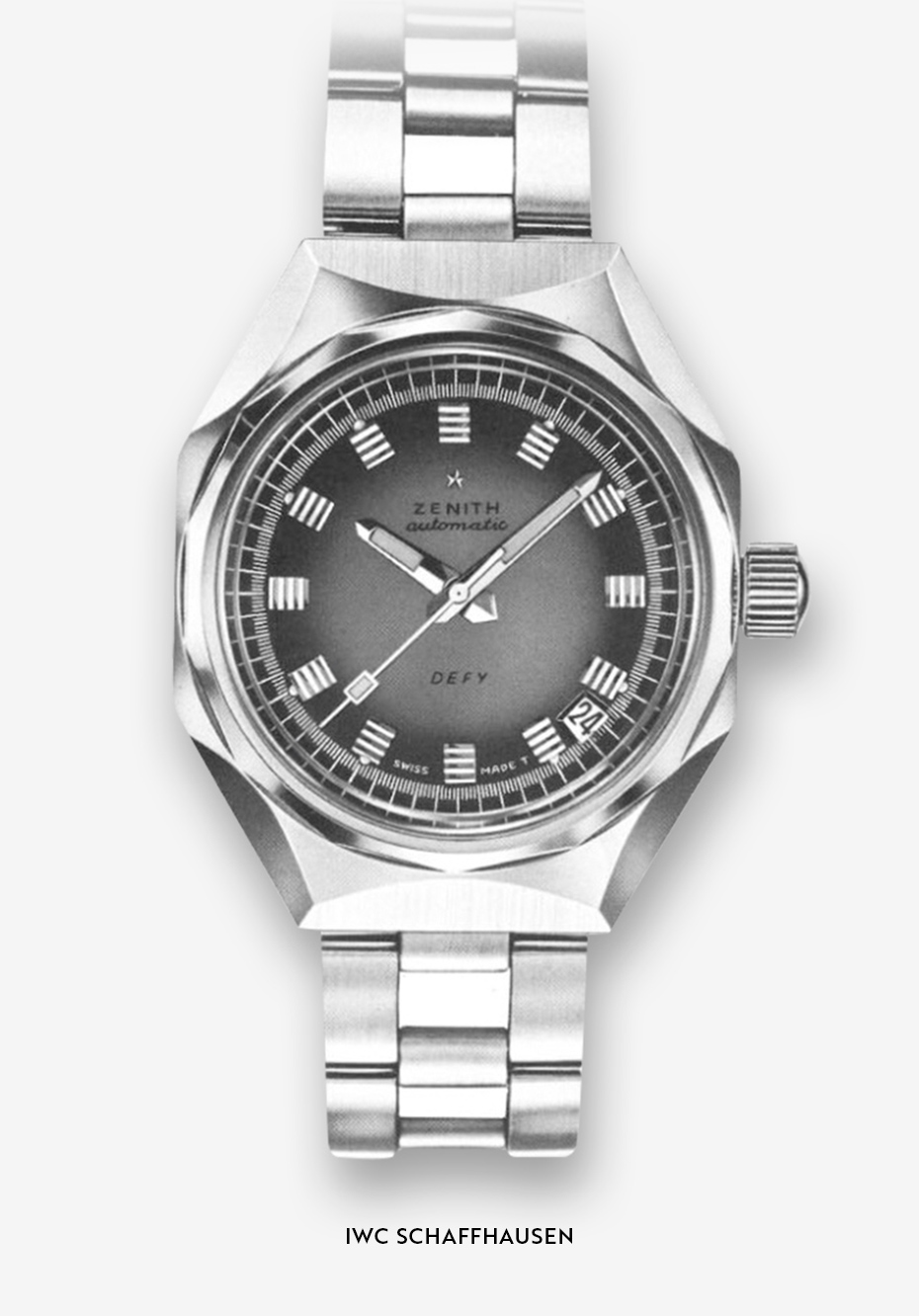 - Zenith: Zenith created the Defy collection when they unveiled it in 1969, featuring its distinctive design while utilising robust construction elements. The initial A3642 model, alongside other initial models, introduced fragmented designs through their multi-faceted cases while also featuring integrated bracelets that would influence future avant-garde designs.
