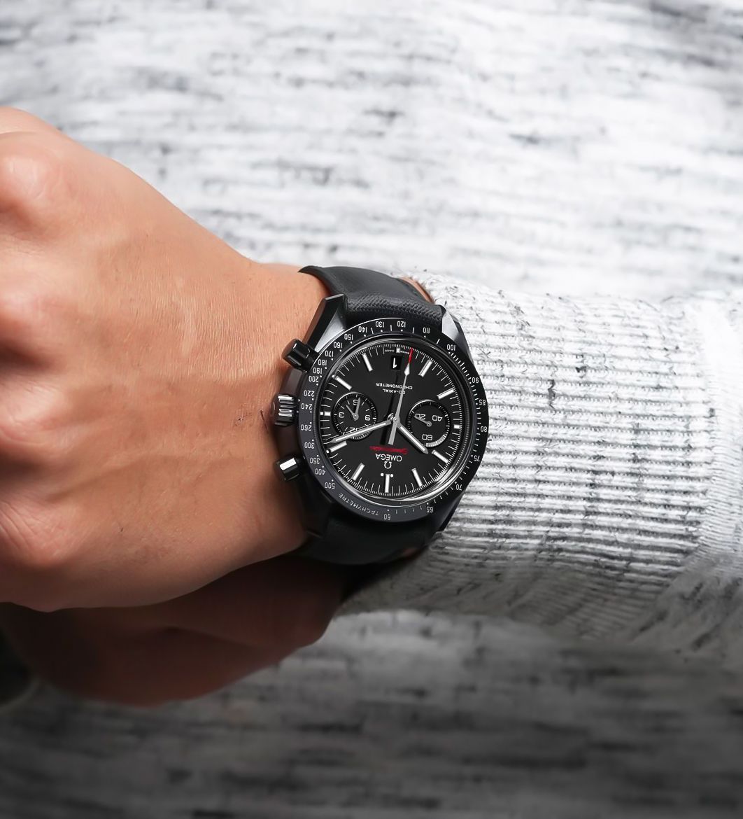 The Omega Speedmaster Dark Side of the Moon is a revolutionary timepiece that exemplifies Omega’s pioneering use of ceramic. It is the first Omega watch with a case crafted entirely from ceramic—specifically, a single block of scratch-resistant zirconium oxide that lends the timepiece an impeccably smooth jet-black sheen. Both the case and bezel are carved from this high-performance ceramic, along with uniquely ceramic crown and pushers that complement the monochromatic aesthetic. This advanced ceramic construction makes the Speedmaster Dark Side of the Moon extremely lightweight, durable and fade-resistant—the perfect evolution of a time-honoured Moonwatch icon.
