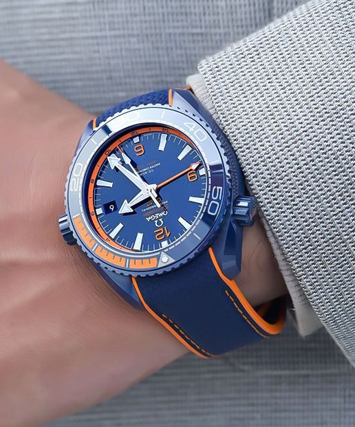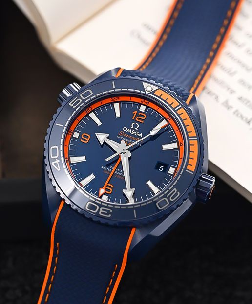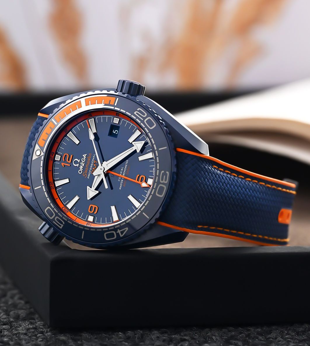 Omega gave its Seamaster Planet Ocean a big update with the eye-catching ‘Big Blue’. Encased in a hefty 45.5mm blue ceramic case, this sporty timepiece makes a vibrant nautical statement. The unidirectional rotating bezel features a Liquidmetal diving scale with an orange ceramic inset from 0 to 15 minutes. On the wave-edged caseback, Omega implements its patented ceramic Naiad Lock. A helium release valve at 10 o’clock and a transparent exhibition caseback add professional diver functionality.