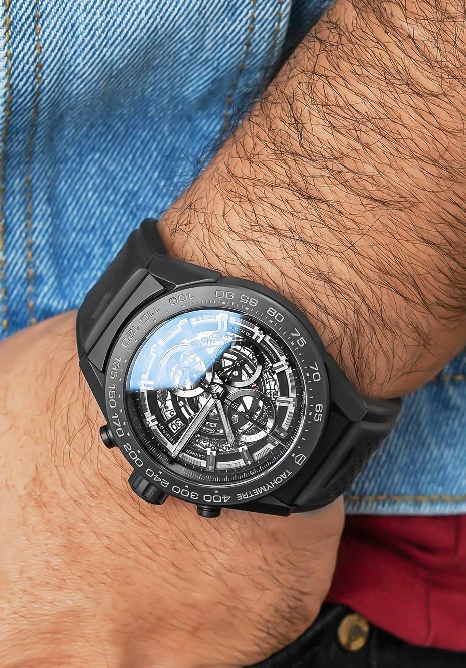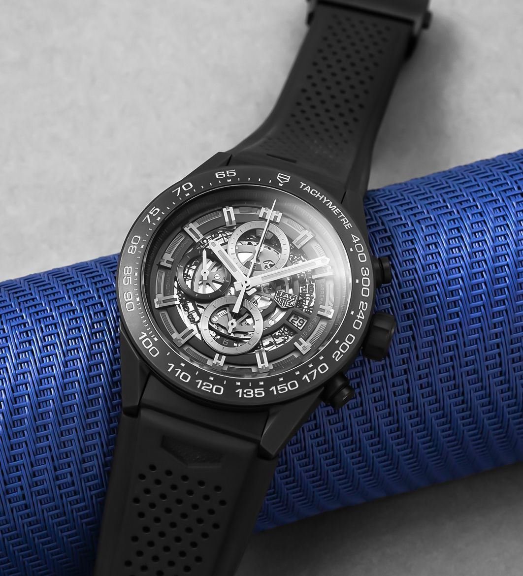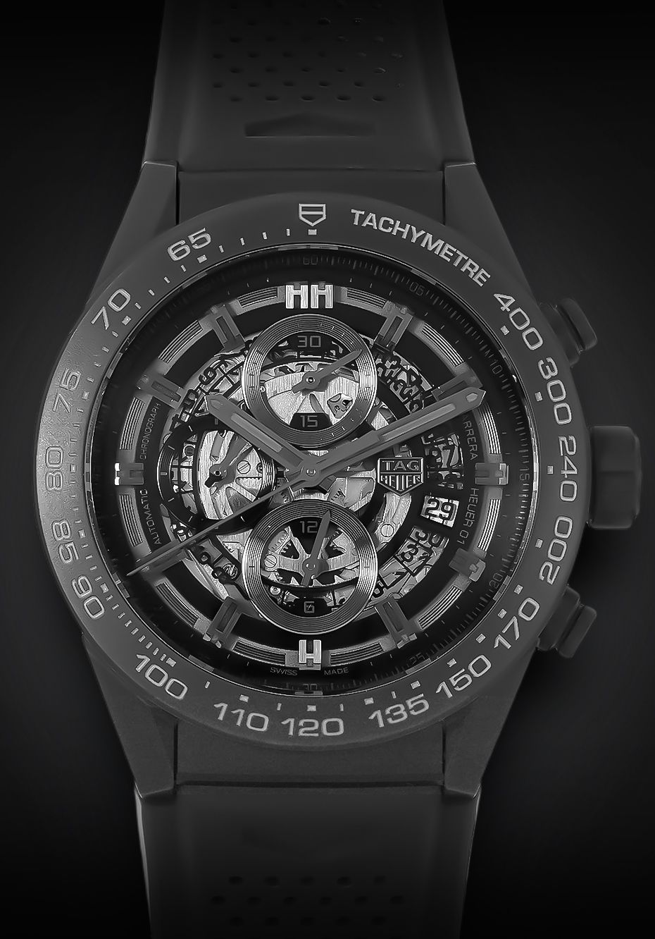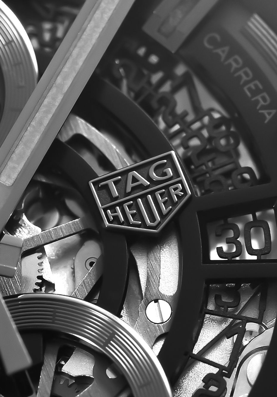 Through an anti-reflective sapphire crystal, the open-worked face reveals the high-performance Heuer 01 calibre. Its column wheel and vertical clutch allow precise timekeeping through hours, minutes, seconds and dates. A small seconds sub-dial sits at 9 o’clock, balanced by a 30-minute counter at three. The tachymeter scale on the sleek ceramic bezel captures the Carrera’s adventurous racing spirit. On the wrist, the black rubber strap highlights the monochromatic colour scheme, secure with a sandblasted grade 2 titanium folding clasp. This advanced Swiss-made ceramic Carrera fuses TAG Heuer’s passion for avant-garde materials with watchmaking mastery.
