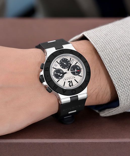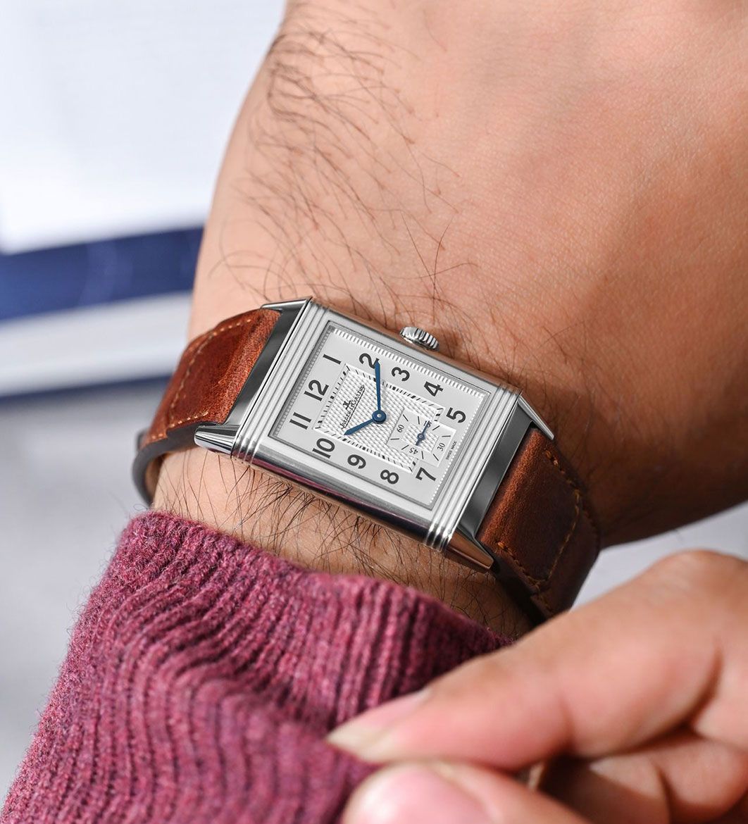 Originally conceived as a model curated for polo players, Nick Jonas’s Reverso is an upgraded version featuring a manual winding calibre 822. The monoface design is set in a stainless steel case and is held by a brown leather strap.